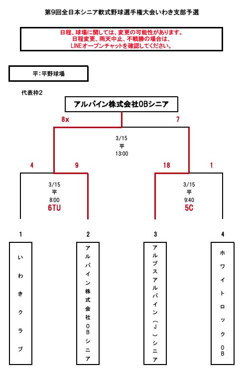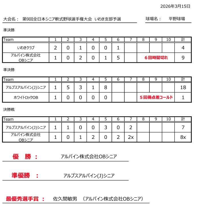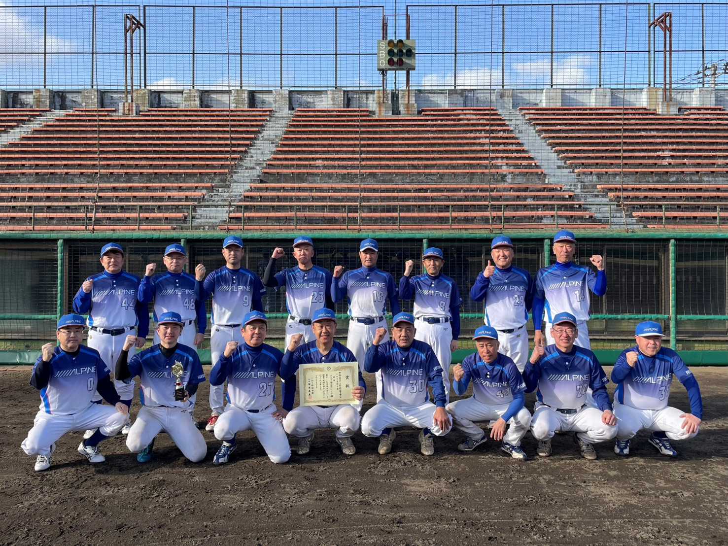 3/15(日) いわき市営平野球場にて『第9回全日本シニア軟式野球選手権いわき支部予選』の準決勝並びに決勝戦が行われ、アルパイン株式会社OBシニアが優勝致しました。